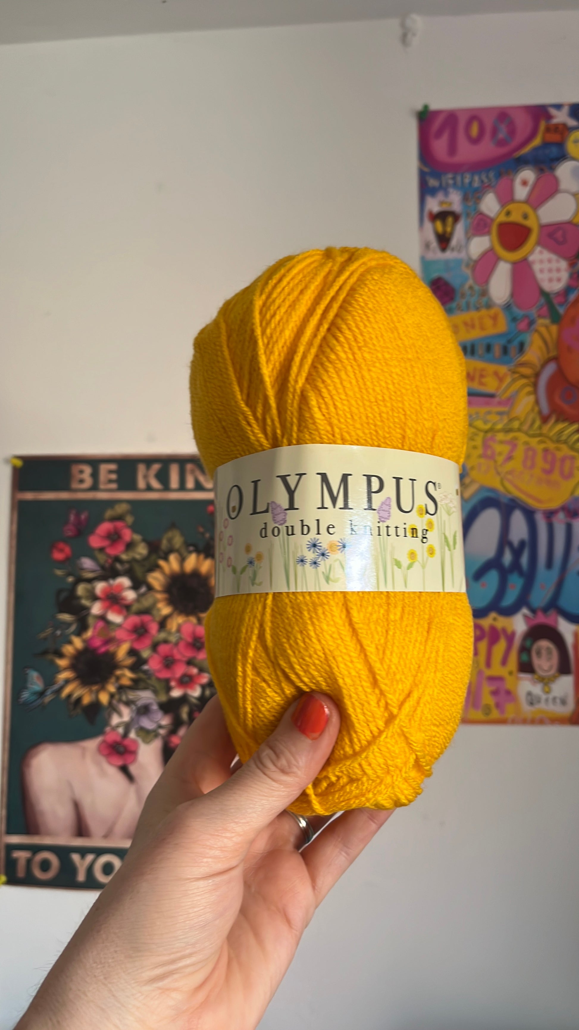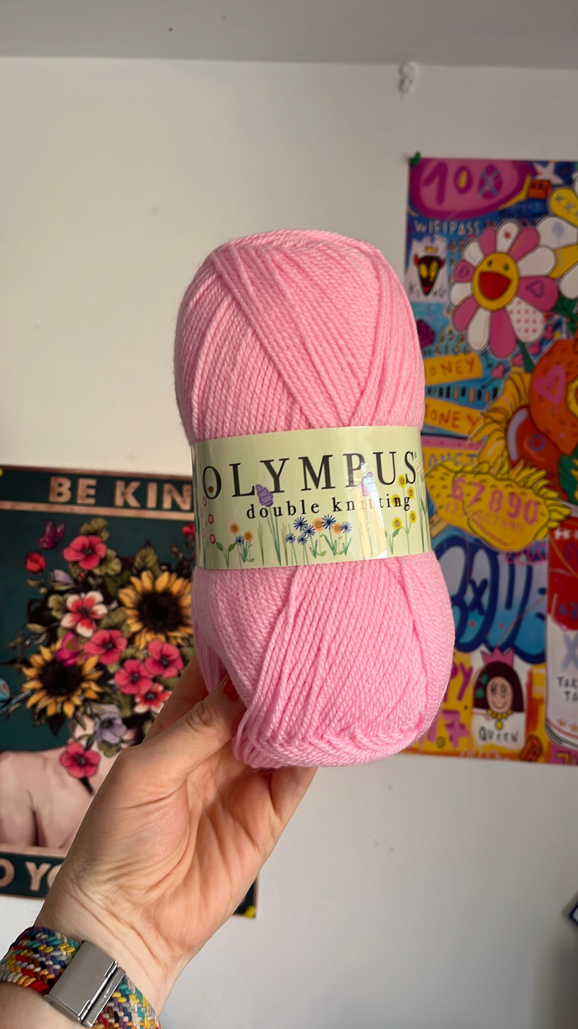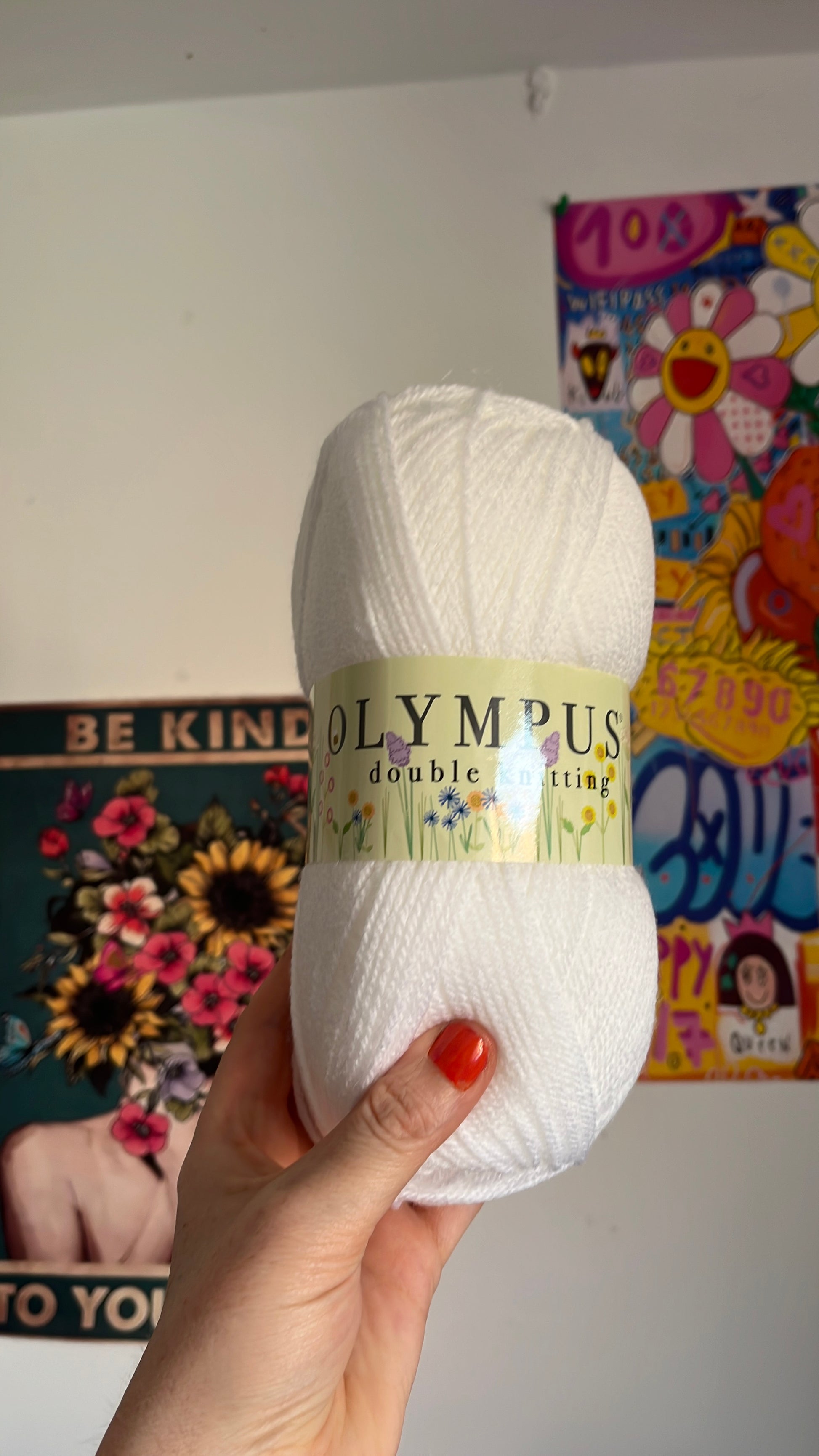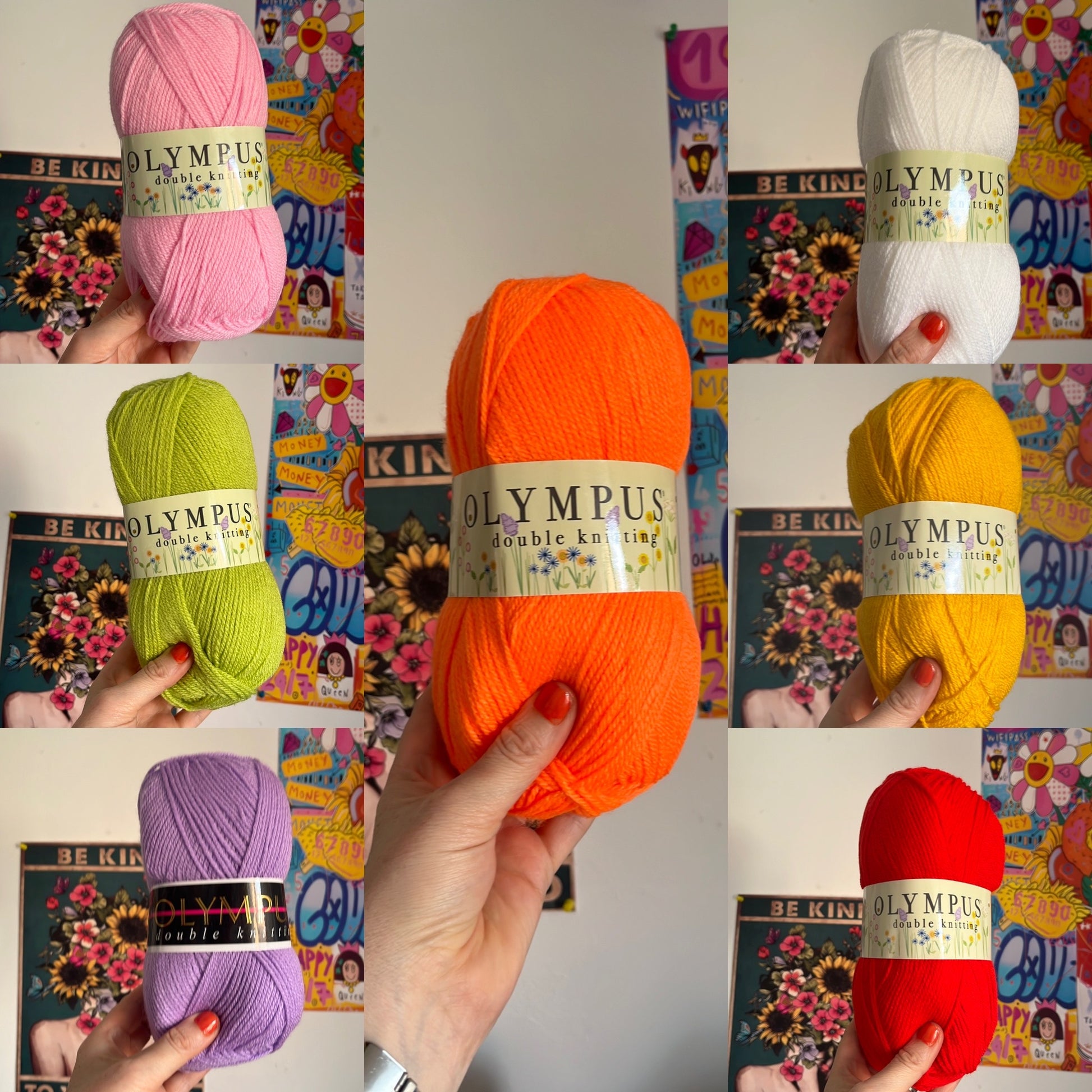 100 g balls. Olympus double knitting yarn. Machine wash at 40° size 4 crochet hook one hundred percent acrylic.