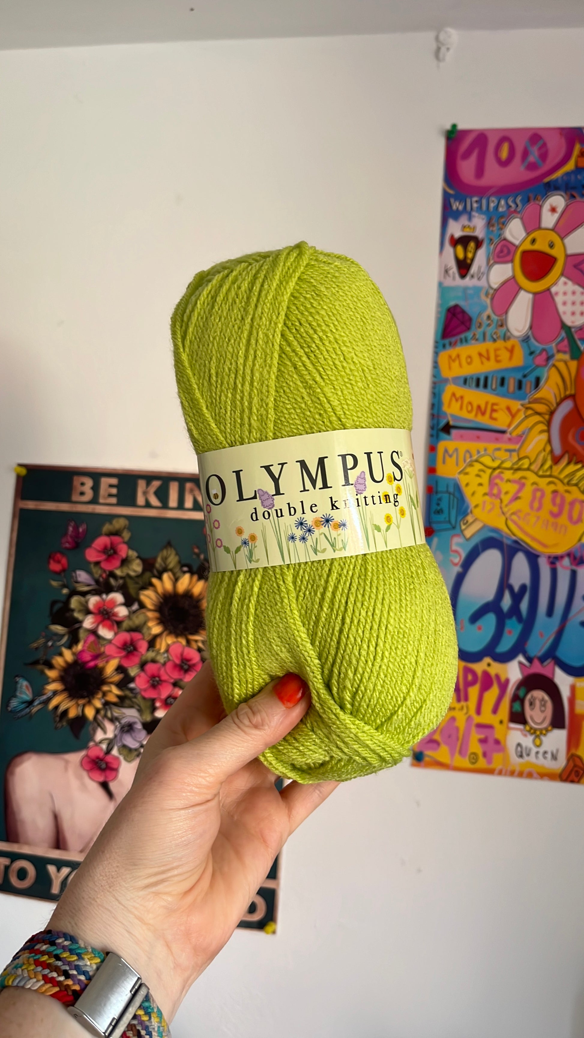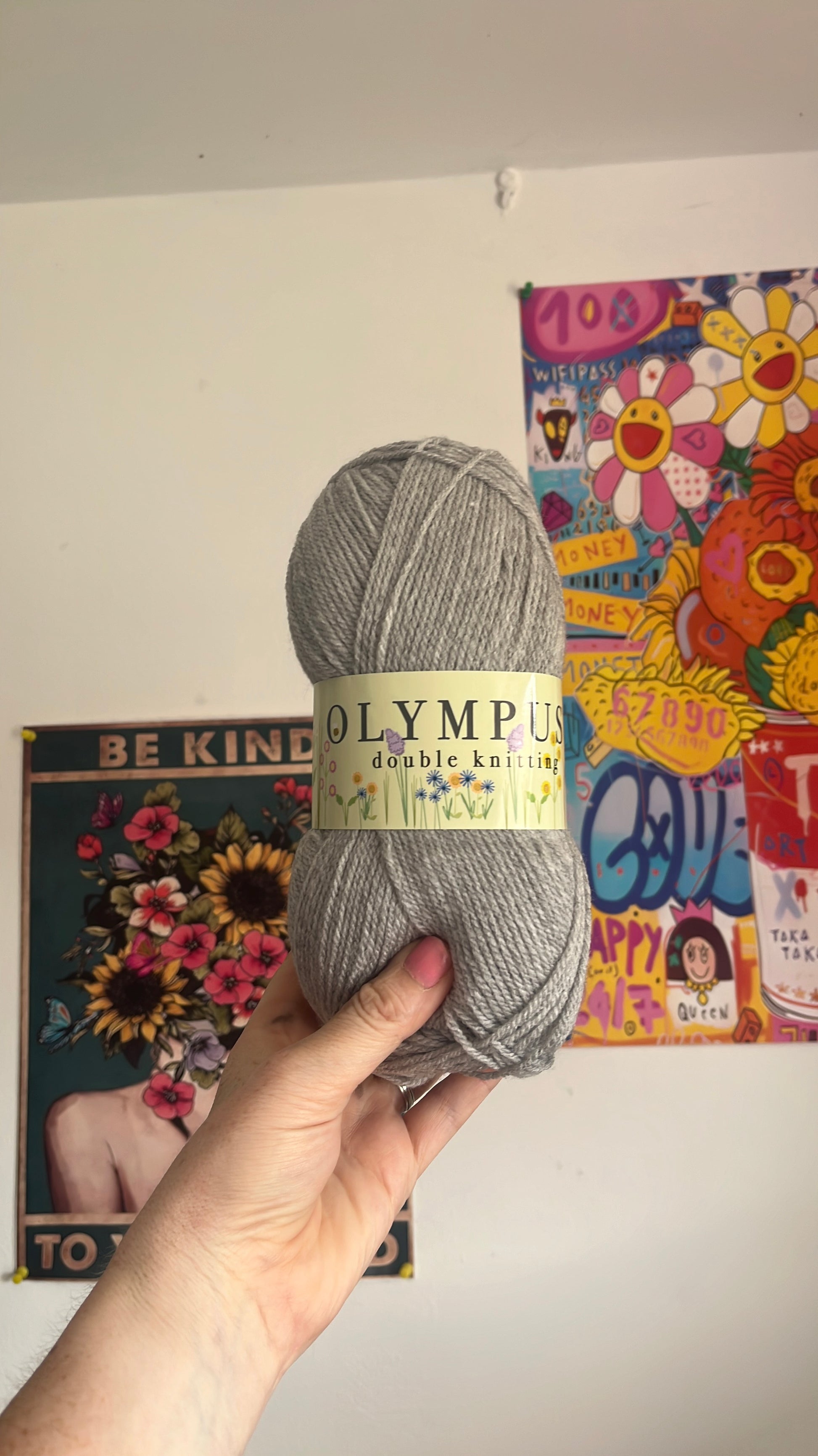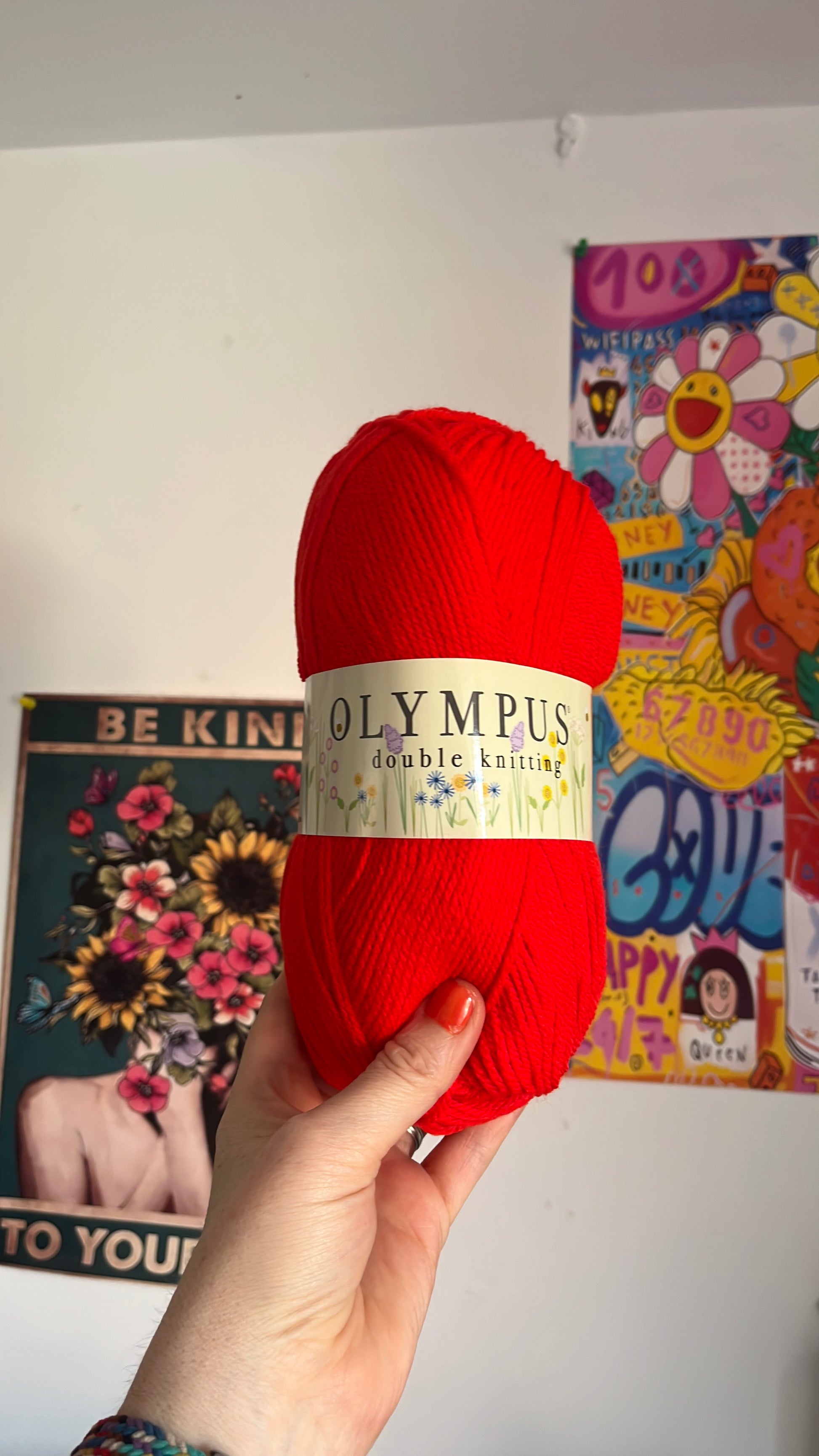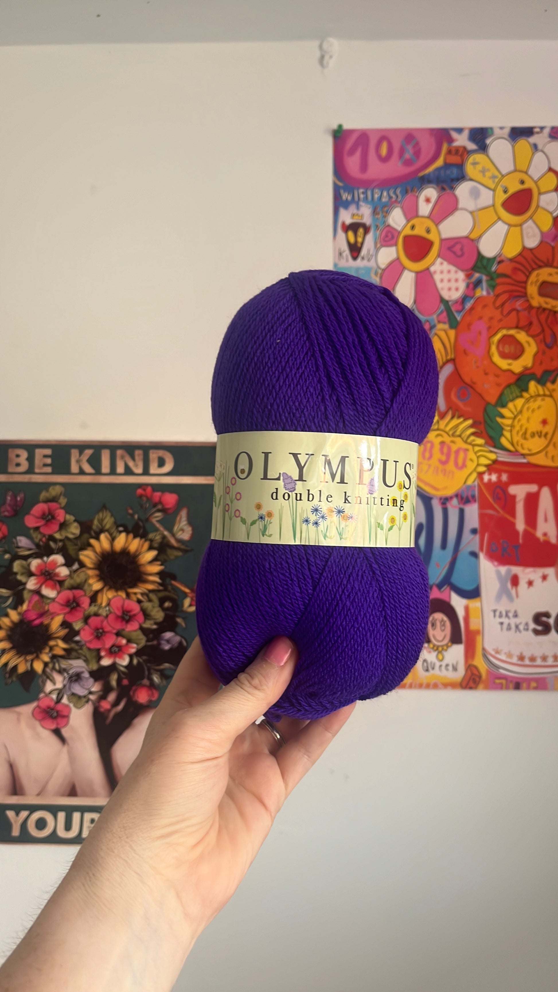 100 g balls. Olympus double knitting yarn. Machine wash at 40° size 4 crochet hook one hundred percent acrylic.