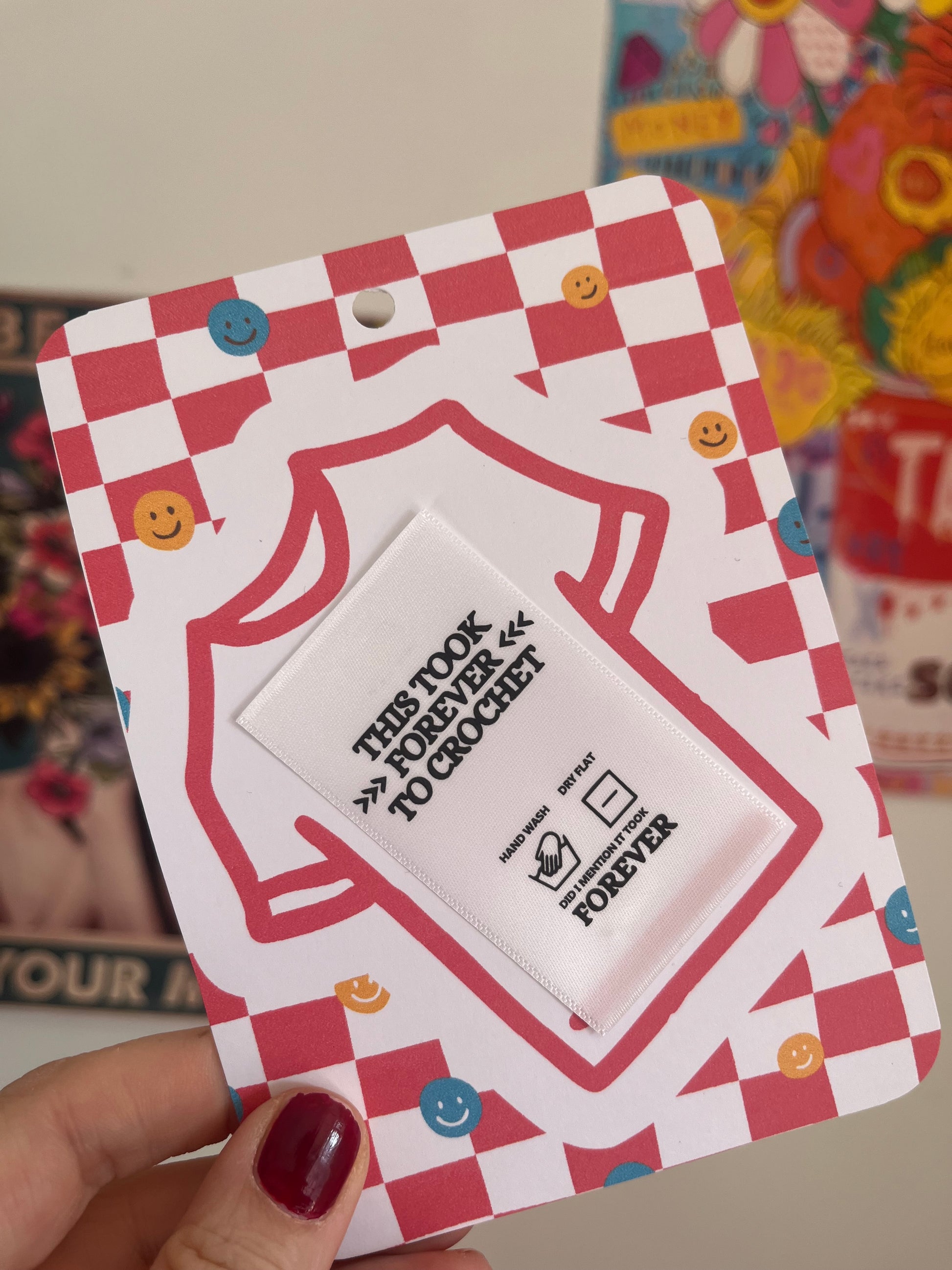 Add the perfect finishing touch to your handmade crochet projects with this fun and stylish “This Took Forever to Crochet” woven label. Designed especially for crocheters, this high-quality sew-in label is a playful way to showcase the love, time, and dedication that goes into every handmade piece.