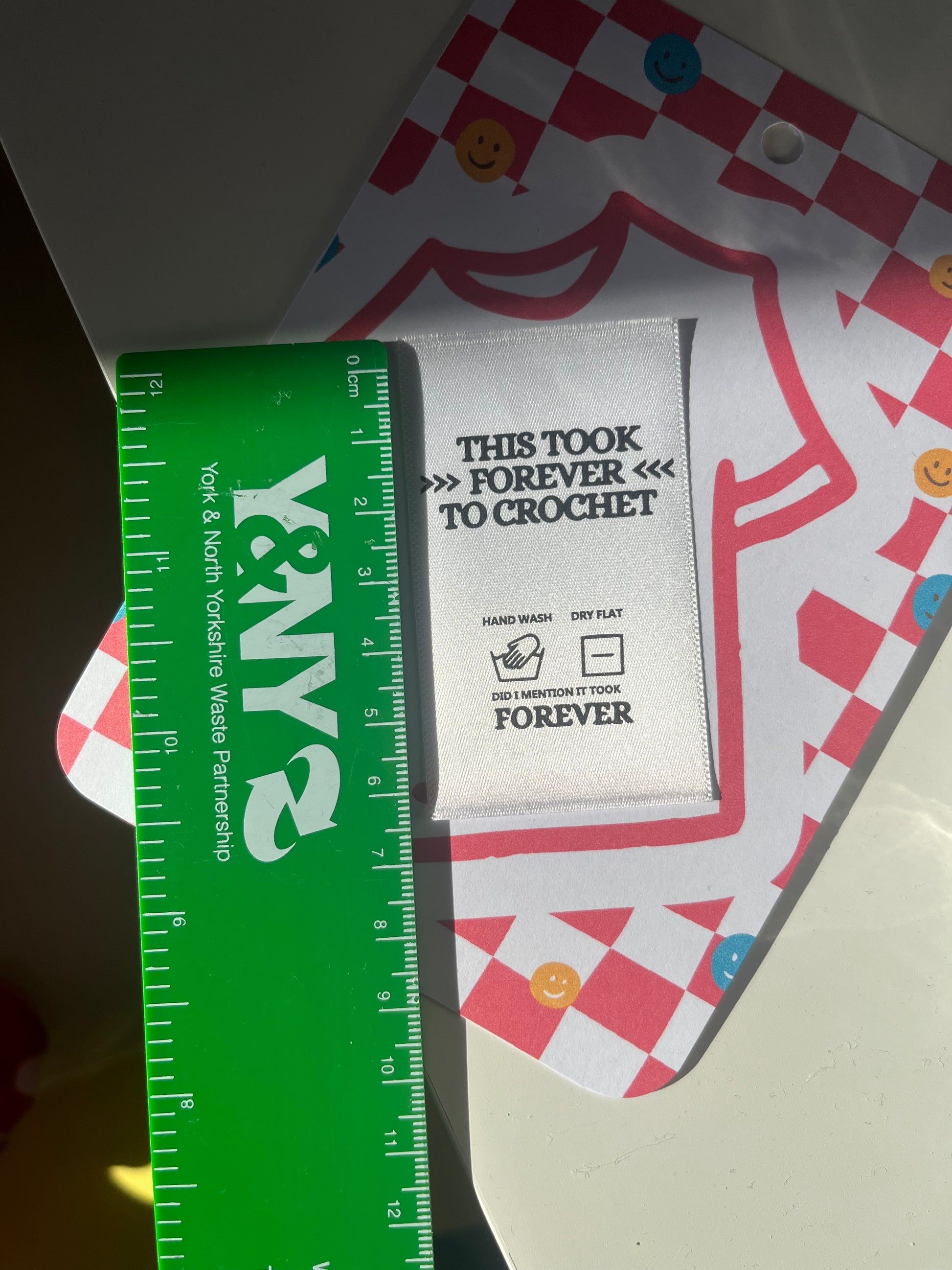 Crafted from durable woven fabric, this crochet label features bold black text on a white background, complete with quirky care instructions that say “Hand Wash, Dry Flat, 80% Handmade, 20% Forever.” It’s the ultimate badge of honour for makers who want to add personality and professionalism to their creations.